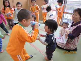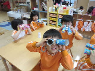 旧園舎時代に作っておいた双眼鏡を使って、3歳児が探検に出かけました。