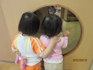 双眼鏡に興味津々の0・1歳児のお友達ですね