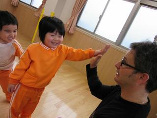 このショットは、一列に並んで、先生とタッチをしているところです。