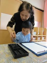 習字の先生にお話しを聞き、さあわくわくどきどきの一日目の習字の時間がスタート