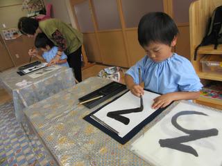 2歳児の子ども達がお絵かきを始めました。 好きな色のクレヨンは、しっかり手に持って・・・上手ですね みんなで楽しそうに書いているこの紙は、先日のお遊戯会で後ろの壁面に使われていたものです これは、大きな雲。 自由画帳も良…