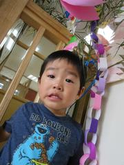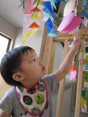 保育園の玄関に飾った七夕飾りでポーズを取っているのは、2歳児さんです
