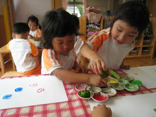 保育園で採れたおくらやピーマンで野菜のスタンプ遊びです