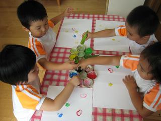 育てた野菜を使ってこの日はペタペタとスタンプ(^^) いろんな形ができてとても面白いです(^^♪ 身近ないろんなものが製作に結びついていきます。