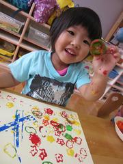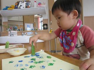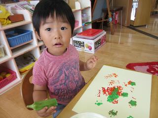 今日は2歳児さんのクラスで、野菜のスタンプを使って遊んでいるようですね(^^♪
