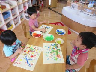おくらに絵の具をつけて、ぺたぺたと楽しそうですね