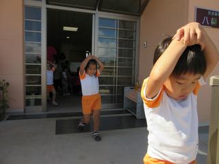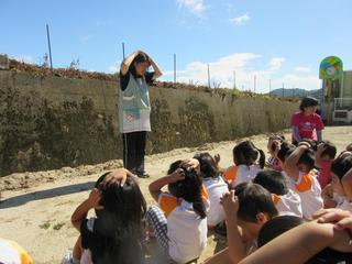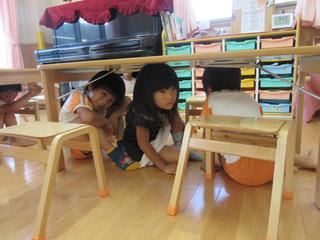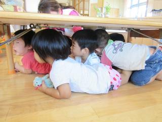 「皆さん、地震ですよ机の下に入ってください」子どもたちは、即机の下へ。