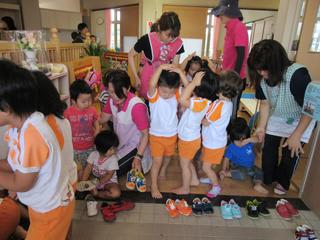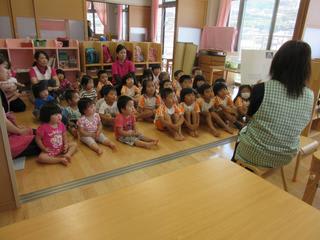 その後部屋に入り、保育士に地震についての紙芝居を読んでもらいました。