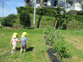 風の強い日でした。 3歳児さんたちは 風にも負けずに野菜畑に行って 先日植えた野菜苗に水遣りをしてきました。 みんなもお腹が空いたら ご飯食べるでしょう? お水はお野菜の ご飯なんだよ~ と伝えると、1本…