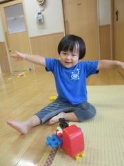 ブロックで「飛行機を作ったよ(*^_^*)」と1歳児さん。