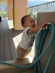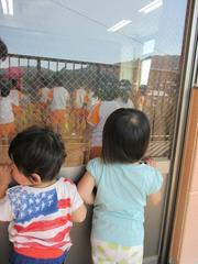 テラスで遊んでいると、以上児さんが太鼓の練習へとやってきましたよ