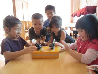 4、5歳児さんはまつぼっくりでお相撲の真っ最中。