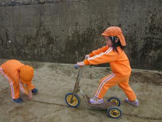 園庭に線を引くと、キックボードでその線の上をなぞっていったり。