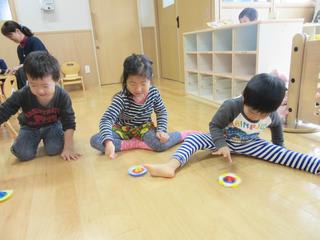 「先生見て~独楽ば回すけん」と自分で作ったり、保育士に作ってもらった独楽を回し競争をして楽しむ子どもたちもいました