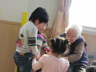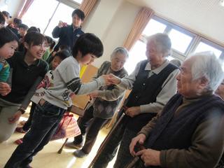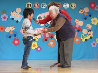 2歳児さんからは手作りクッキー、デイサービスの利用者からは、歯みがきコップ入れ等の手作りのプレゼントが渡されました。