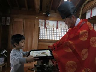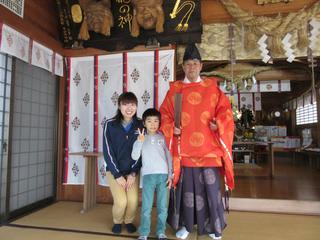 理事長先生と担任の先生に囲まれて、ちょっと緊張気味ですが、神社から帰ってきたときは