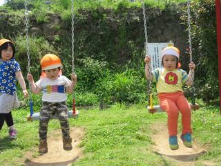 2歳児さんたちは、ブランコに乗るのが慣れていないようですね