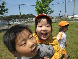 園舎前には、5歳児がグループごとに野菜を育てています。さてそれは何でしょう? ピンポーン!!正解!きゅうりです。黄色の花が咲き始めました。楽しみです。 女の子にモテモテですねぇ。 固定遊具も、成長と共に物足りなくなるのか…