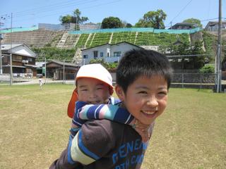 2歳児~小学生の交流が青空の下、自然な流れで行われていました