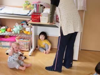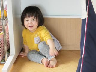 1歳児さんのお部屋に行くと、テーブルの下の狭い空間を楽しむお友達を発見