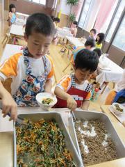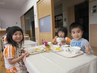 配膳のやり方を5歳児さんが3歳児さんに教えてくれる姿も見られます(^^)