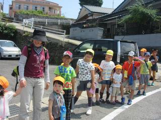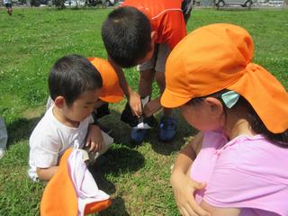 今日は、2歳児さんは小学生のおにいさん、おねえさんと西浜公園へ散歩に行きました