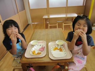1・2歳児さんの給食の時間におじゃましました(^^) 外遊びでたくさん体を動かし、お腹はぺっこぺこ。 食べていると「これな〜んだ?」と問いかけるお友だちと 「ごはん!」と答えるお友だち。すると他のテーブルからも 「これな…