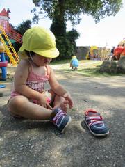 こちらの女の子は靴に砂が入ったようで上手にパンパン!