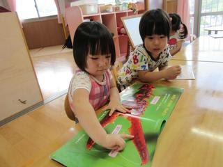 「ここで挟んでたべるとよ」等など、絵本の中の絵をみて考えては、