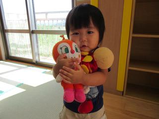 自分の腕からこぼれ落ちそうなお人形をしっかり抱きしめてのお片づけ