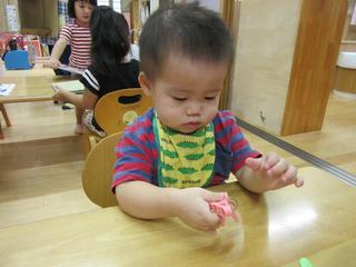 同じように椅子に座り、洗濯ハサミを手に取る0歳児さん。