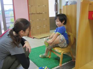 右左間違えないように、上手にお靴を履いて見せる2歳児さん。