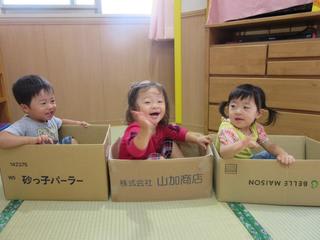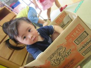 1歳児のお部屋をのぞいて見ると、段ボール箱に入って遊ぶ可愛い姿があります。