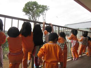 めったに飛んでる所は見れないので、園長先生も「来てごらん」と言ってくださったので、食事も途中でテラスへ集合!