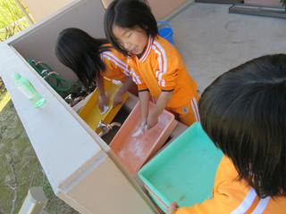 「ねぇ、先生見とって~!!」 何をするのかと見に行くと・・・ 手をブラ~ンと伸ばし、 「洗濯物~」 これが出来るようになったことが嬉しかったようです こちらでは、4歳児の子が3歳児の子の手に何やら付けていましたよ 何をし…