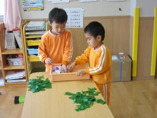 ひも通しの材料を、他の物にみたてて遊んでいましたので、「何??」と尋ねると。「たこ焼き中」と返事が返ってきました。爪楊枝まで準備されていて、きれいに容器に並べているのを見ると、ほんとたこ焼きみたいでした。 他には、木片を…