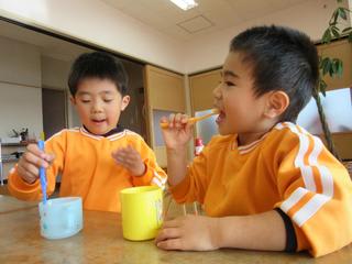 子どもたちは食後の歯磨き中。さあ!きれいに磨けたかな