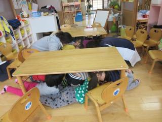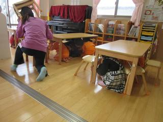 楽しいお話や笑い声は急に止んで、机や椅子を使って身を守っています。