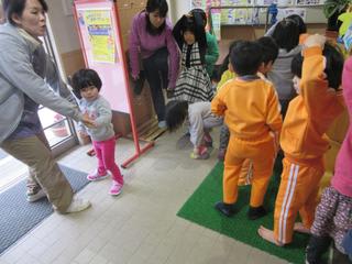 保育園の玄関では、ランドセル姿の“くまもん”がお出迎え中。 様々な色の折り紙でランドセルを子どもたちが作ってくれて、春らしい雰囲気になりました。 さて、今日は0歳児さん…