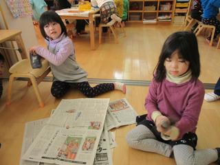 さっそく、新聞紙を家から持ってきたり、棒状に丸め方を統一しようとしたり確認しながら作業を進めてました。