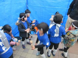 とても寒い日でしたが、テントの中では身支度をととのえた子どもたちがけん玉で身体を温めて出演を待っています。