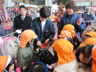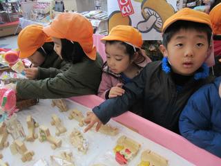 福祉フェスタのお店も見て回りましたが、園児の体操服でお世話になっている施設の方から、糖度が高いミニトマトの試食をいただいたり、おやつはどれにしようかな・・・?木工品のおもちゃを見て「かわいい!」と歓声をあげたり・・・