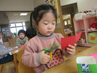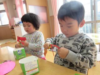 2歳児さんのクラスでは、はさみを上手に動かして、何か・・・を制作中です