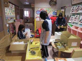 3歳未満児さんがお昼寝してる間に、職員がせっせと大きな箱を運んでお雛様が登場!