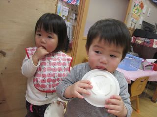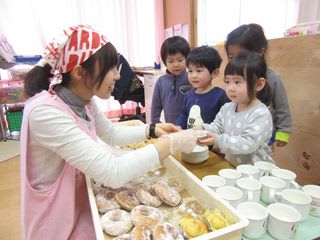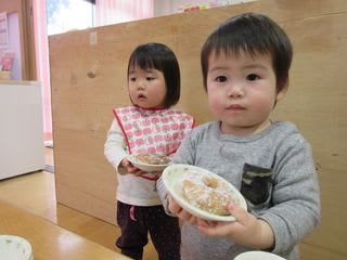 どれにしようかな・・・?ちょっと緊張気味のお二人さんはパン(ドーナツ)を落とさないように気を付けてお皿を大事そうに持って、保育室に帰っていきました(^_^.)