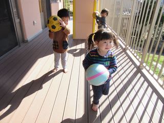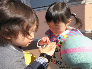 朝登園してから、先生のお手伝い。 「これ何かなあ?」 「お花みたいね」 「どうするの?」 「ほらこうやって・・・」って会話があったかなかったかはわかりませんが、この写真から見て、女の子のほうが早く手がけていますね。 お散…
