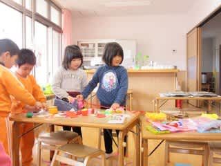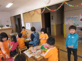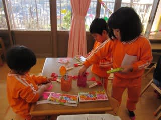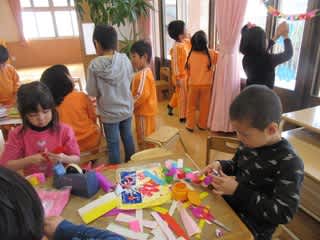 お始まりの後はランチルームに移動して、折り紙やクレヨン、リボン・・・・と様々な物を利用して飾りを作っていました。