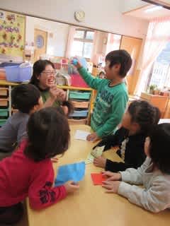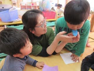 折り紙で作った風船に息を吹き込んでいる一コマ。