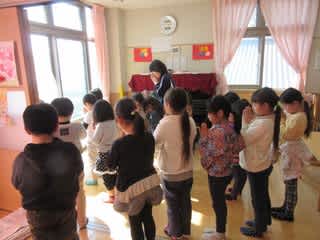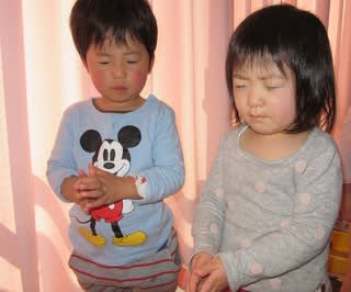 小さい子どもたちは午睡から目覚めたばかりの時間に時間を告げるサイレンが鳴って、黙とうを捧げました。