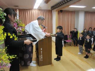 神社本庁証書や保育証書を堂々とした姿で受け取る卒園児。